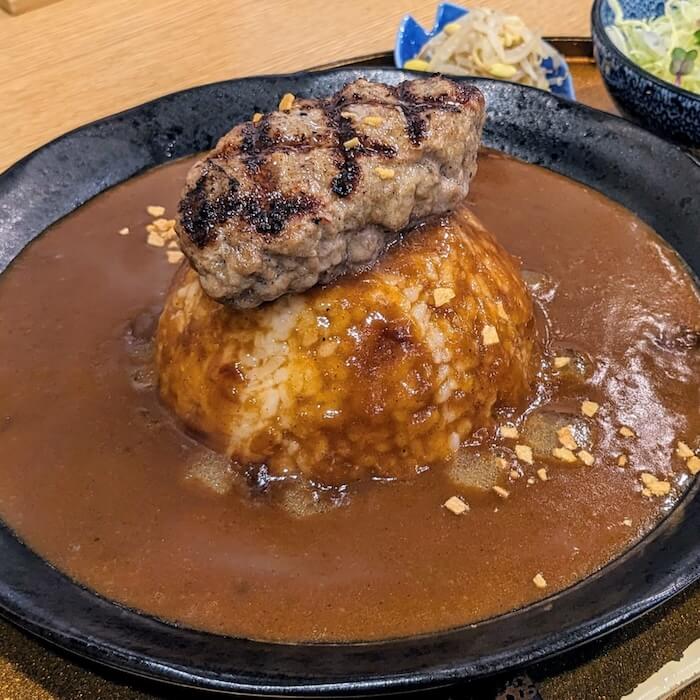 創業100年の老舗肉卸店が営むハンバーグ専門店のハンバーグカレー。じーっくり焼き上げた(けっこう待ったなぁ)肉汁ジュワジュワな国産牛ハンバーグはさすがの美味しさで、かなりスパイシーめの大阪風甘辛カレーとの相性もベリーグッド。